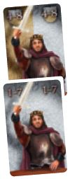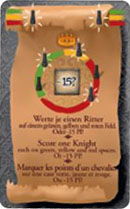 The player who plays this card must choose one of his Knights on a green (1 to 10) space, one on a yellow (3x 0) space and one on a red (-1 to -15) space and score all three, moving his scoring marker forwards or backwards the corresponding amount.