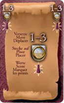 The player who plays this card must choose three of his Knights located on red spaces (-1 to -15) and score them, moving his scoring marker backwards the corresponding amount.