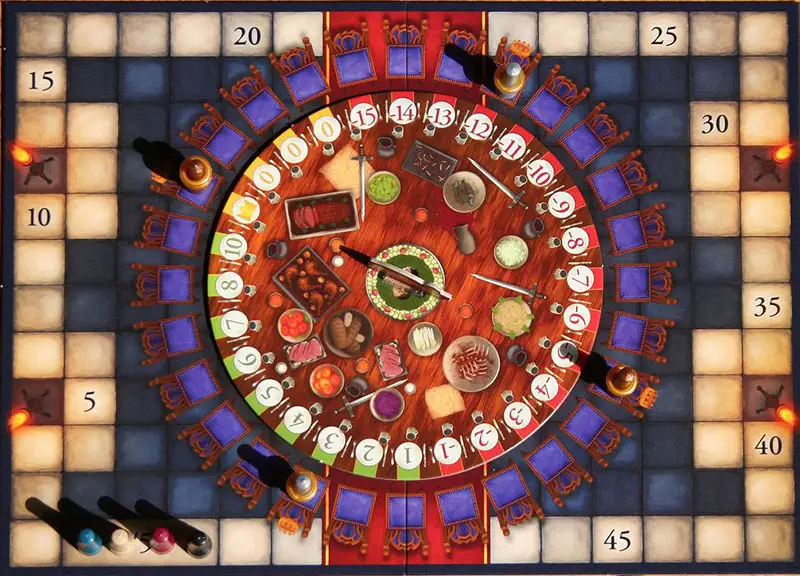 Now, using the suckling pig, rotate the table so that the plate with the crown is immediately adjacent to King Arthur. It will remain there for the rest of the game. Should the King move or a new King be crowned, then the rotating board is immediately rotated to suit the new King's location.