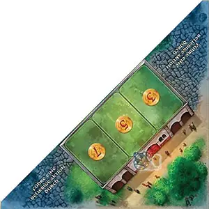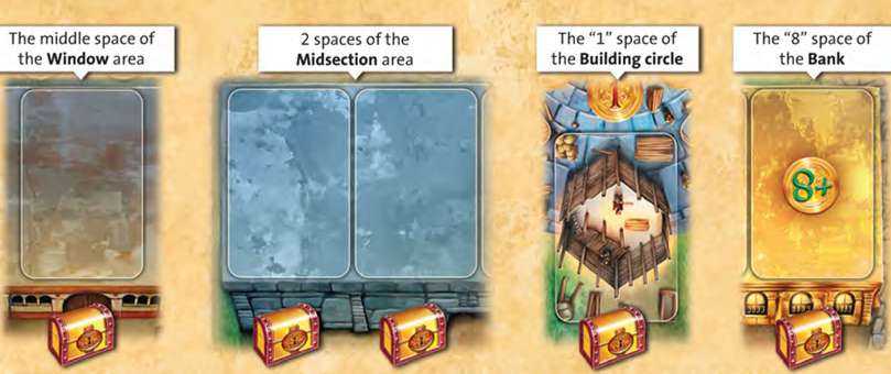 Place golden treasures on the five market space shown below. For the basic game, remove the four Gift cards with the lighted windows and use the remaining twenty Gift cards.