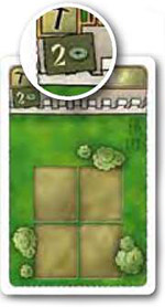 (The two pale-colored spaces in the Shop remain empty. As a general rule: dark price tags show the cost that must be paid to buy the vegetable; pale price tags show the price a player can receive for selling it to the Shop). - 8 Private fields (with green backs): 2 sets, each of 4 cards with 3, 4, 5 and 6 spaces. Shuffle each set of 4 cards then place one set on top of the other, face-down and to the left of the Home field. This forms the Field pile.
