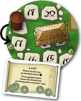 At the end of the game, players' Scoring markers are moved backwards 1 space along the Path of Prosperity for each Loan that they have taken out. Loans can never be repaid.