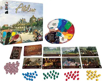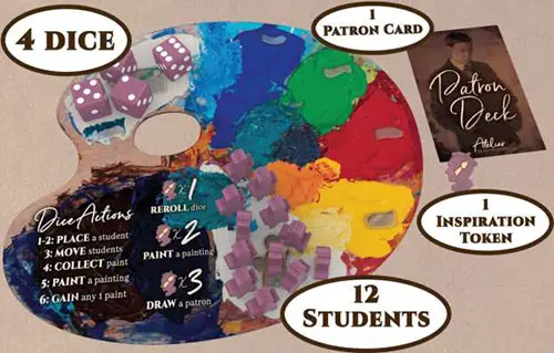 In Atelier, players play the role of master 19th-century painters managing their ateliers (workshops). Players roll dice, then use those dice to instruct students and acquire paint to render masterpieces of art.