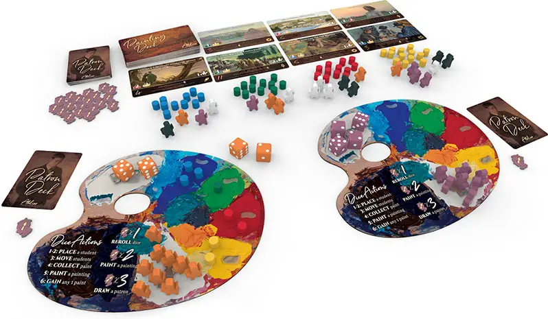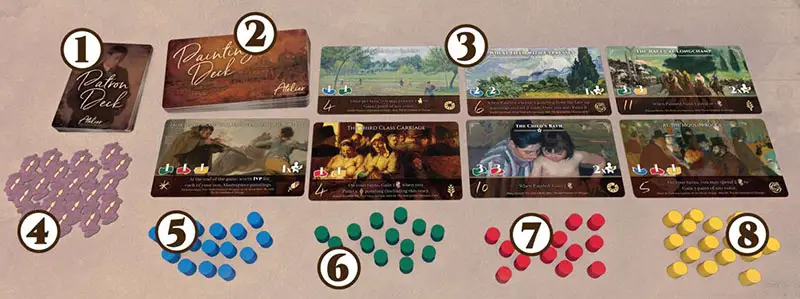 1Patron Deck -2Painting Deck -3Faceup Paintings -4Inspiration Tokens5BLUE Paint -6GREEN Paint -7RED Paint -8YELLOW Paint -