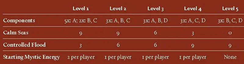 Select or randomly choose components from each of the indicated types, in addition to the Power Core. For your first game, we suggest starting on Level 1 and selecting the Mystic Siphon (B), Matter Converter (B), Numinous Beacon (C), and Entropy Drive (C), in addition to the A components and Power Core. More experienced gamers may wish to start at a higher difficulty level.