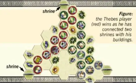 A player wins the game, when he is the first player to either place all 30 of his buildings on the game board or to connect any two shrines with a string of his connected buildings.