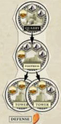 For example, quarry, fortress, and the two towers belong to the defense group.