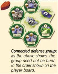 Example: the Corinth player builds his quarry such that he now has all 4 buildings in the defense group connected. He takes an amphora from the supply, places it in his play area, and completes his normal turn.