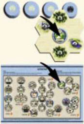 From the building cost, the player may reduce his payment by the landscape symbol shown on the space he builds and by each landscape symbol shown on empty spaces directly adjacent to the building space.