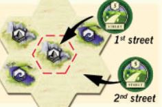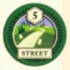 To build a street, a player must pay any 5 landscape cards, reduced by the landscape symbol shown on the space he builds and by each landscape symbol shown on spaces adjacent.