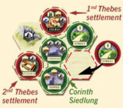 Example: the Thebes player already has 2 settlements. He builds a road on the space shown, founds a new settlement, and must pay an additional 2 landscape cards.