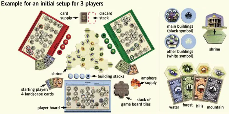 Example: the Corinth player draws a quarry and a tower, he then puts 1 amphora back in the supply and draws another building. Finally, he puts another amphora back in the supply and draw 1 landscape card.