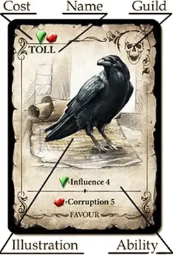 These cards form the Offer Row and can be purchased during the game. When a card is purchased (or leaves the Offer Row for any reason), replace it immediately so there are always 4 face-up favor Cards.
