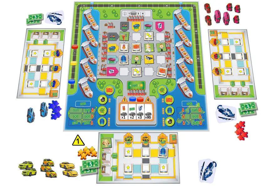 Start with the car with the highest popularity score. The player who owns this car must now decide whether to sell this car or to pass and leave the car on the ship. If the car is sold, the owner places the car on any free sales space in the North American market and takes the reward shown in the space.