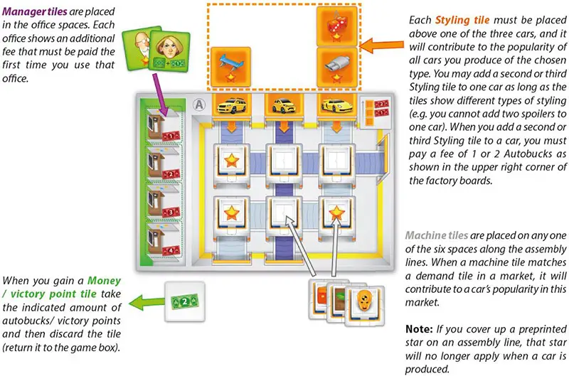 When taking a tile, the tile must either be placed in your factory or discarded. Once placed, a tile cannot be moved, but it may later be replaced by another tile: Machine tiles may be replaced by any other machine tile, while manager tiles and styling tiles may only be replaced by other manager and styling tiles with the same image (same portrait or same styling part).