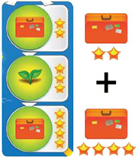 Example: Red player has 12 Autobucks, Blue and yellow players both have 7, Green player has 3. Red scores 10 points. Blue and yellow are tied, but since blue has the sales offce with the lower number, Blue scores 6 and yellow scores 3 points.
