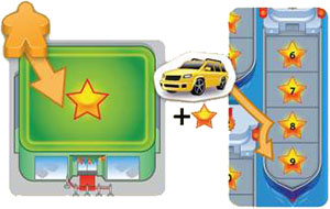 The total number of stars is the car's popularity score. Place a car tile on the matching ship space above the chosen market. If the ship space matching the car's popularity score is occupied, you must place the car on a vacant space with a lower value.