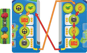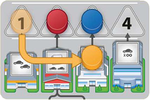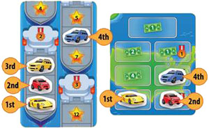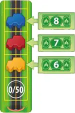 The scoring markers are placed on the spaces on the scoring track corresponding to each player's player order (i.e. 1st player places their car on space 1, 2nd player on space 2 and so on). Whenever a player scores victory points during the game, advance their scoring marker on the track.