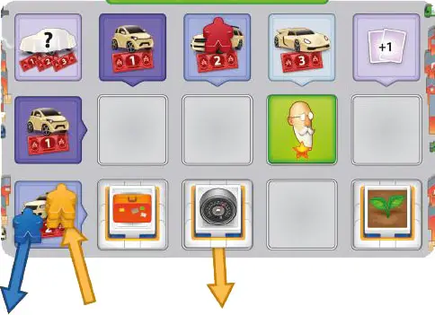 If you choose a production action, you must pay the shown cost and produce the shown type of car. If you use the corner space you choose which type of car you want to produce, and pay the corresponding cost (1 for city car, 2 for family car, 3 for super car).