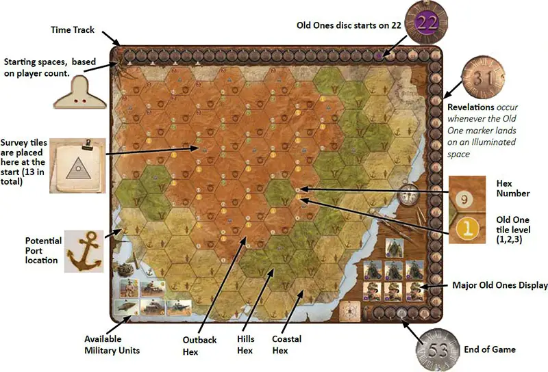 At a point in time, the Old Ones will wake and effectively become another 'player', with a disc on the Time Track and will begin to reveal themselves and move. The Old Ones always move towards the closest settlement, whether it be a farm or a port. If they reach a farm, they will blight the land, while if they reach your port and you fail to defeat them, the game will end immediately.