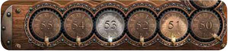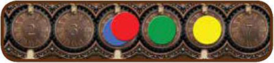 Record Victory Points using the player discs on the Time Track. If a score goes over 55, move the marker to 0 and keep scoring from there. No points are scored for unused resources and/or Gold.