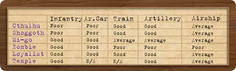 - Infantry and Armoured Cars are good against Zombies and Mi-go, but less effective against Shoggoths and Cthulhu.