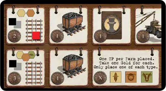 Set the board to show the Eastern map (as shown 3. above). Select a color and take the corresponding set of pieces. You will have seven of each type of Farm (Sheep, Cattle, Corn), twenty Railway tiles, twenty cubes, three discs, one Port marker, and 4. one Player Board.