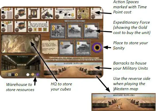 Place your Player Board in front of you with the 'Eastern Barracks' showing and place your cubes in the HQ box. The rest of your pieces are placed by the side of your Player Board.
