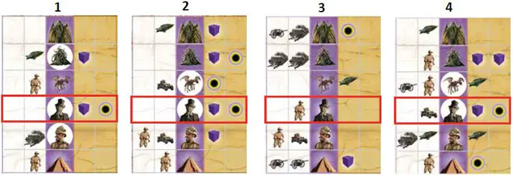The fourth card inflicts another damage on the Zombie, which eliminates it. However, another damage has been inflicted on you, and you decide to allocate it to Infantry, thus losing one Infantry unit. Note that you cannot allocate it to your Airship.