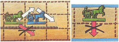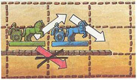 The chariots must be moved forwards, never backwards or sideways. They can change lanes at every dashed line by moving diagonally forwards to the next lane.