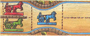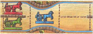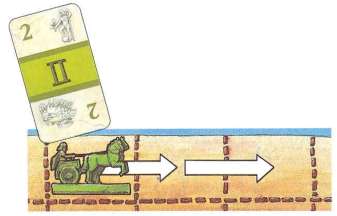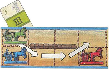Each player must play a race card and move on his turn even if it is to his disadvantage. A chariot must move exactly the number of spaces shown on the card. If a chariot cannot do so, the player doesn't play a card, and misses his turn.