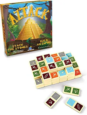 Journey to the age of the great Aztec civilization and build a temple to please the high priest. Players stack inscribed stones according to divine laws: the stones must match the ones beneath by color or glyph.