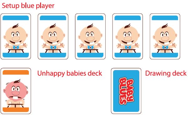 Other happy baby cards that are not used are put back in the box. During the course of the game, players are allowed to look at the value of their babies. Put the drawing deck and unhappy babies within easy reach of all players.