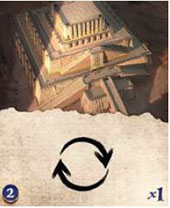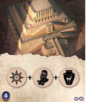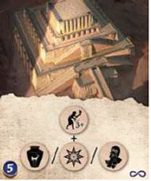 ![]() All the land hexagons that surround the Ziggurat are occupied, and it is therefore scored. Adam has 3 tokens next to the Ziggurat, Nora has 2 and Valentina has 1. Therefore, Adam can choose one of the available Ziggurat Cards. The Ziggurat stays where it is. |