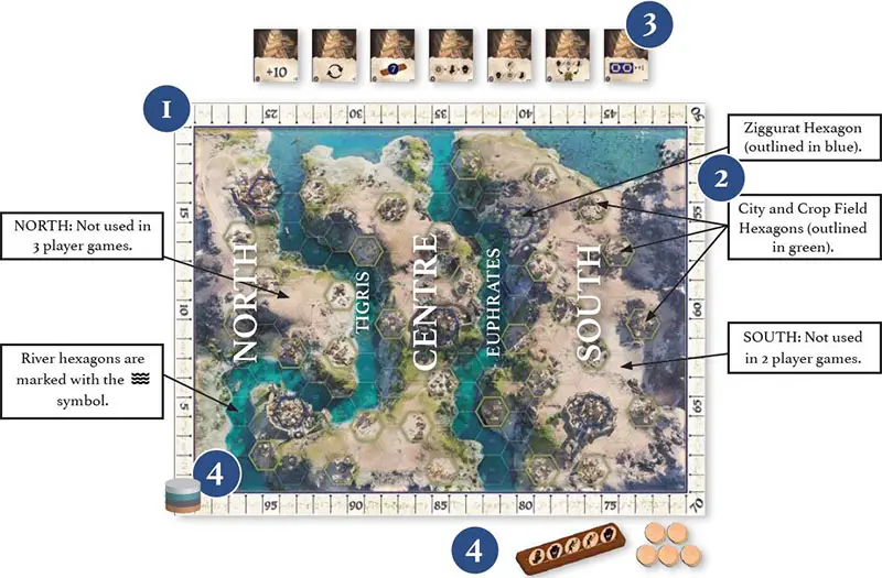 Place the board in the centre of the table. This shows the south-eastern region of ancient Mesopotamia with its two main rivers, the Tigris and the Euphrates.