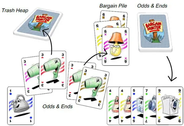 Sort all cards in your odds and ends stack. Starting with the player who won the last trick, each player may discard all of their cards of a single value to the trash heap. You may, however, be able to create bargains from odds and ends! Only the first: