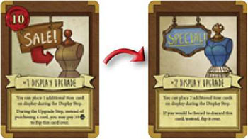 Upgrade Cards come in two types: The Display Upgrade can allow the player to place additional item cards on display. The Storage Upgrade can allow additional cards to be placed in storage and saved for later rounds.