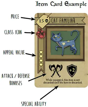To sell an item, take tokens from the hero card equal to the price of the item card and place that item under the hero card so that the item's bonuses and abilities are displayed.