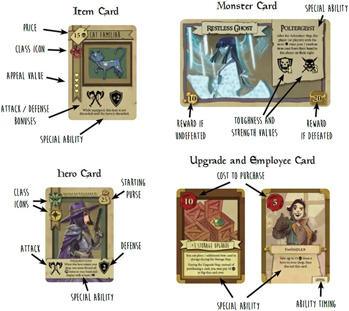Once all shops are occupied, you can sell item cards from your hand to the hero in your shop. You can sell any number of items to a hero so long as the item card has an icon that corresponds to the hero's class.