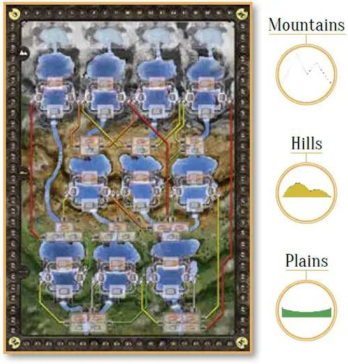 The Map represents a part of the Alps and is divided horizontally into three areas: Mountains, Hills and Plains (from top to bottom). Each area is identified by a different background and a specific symbol.