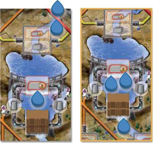 The Conduit connecting the two structures can belong to any player. If it belongs to the player performing the action there are no extra costs; if it belongs to another player, the player performing the action must pay 1 Credit to the player who owns the Conduit, while the player owning it will score 1 Victory Point, for every Water Drop that was moved through the Conduit.