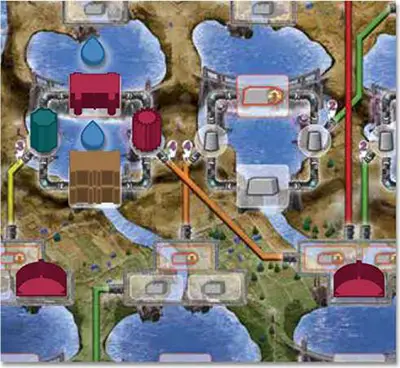 The colored tubes illustrated on the Map represent possible connections that only become active when a player places a Conduit piece in the corresponding building space).