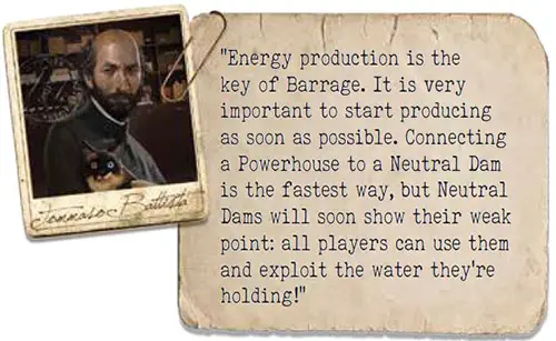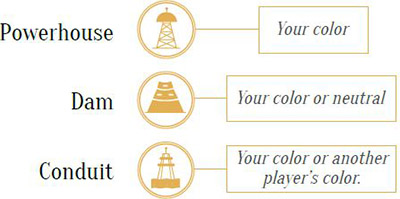 Players must build Conduits to connect the various structures. An active Conduit connects all the Dams on the originating basin to all the Powerhouses on the ending basin. A Dam and a Powerhouse in the same basin are not considered connected.