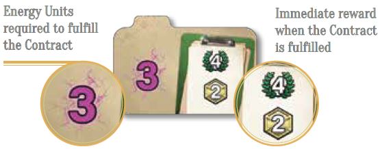 In addition to being recorded on the Energy Track, the energy produced can be used to fulfill a Contract. The necessary Energy Unit required to fulfill the Contract is indicated on its left side.