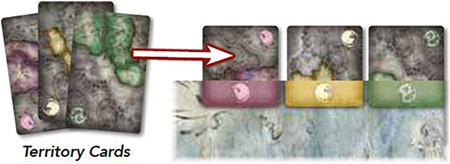 Randomize Territory Cards: Place one random card from each territory facedown under the matching territory space along the edge of the game board. All territory cards not placed under the game board are returned to the game box.