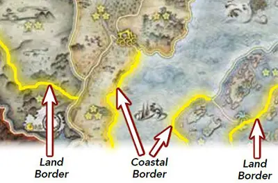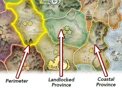A province is an area of the map surrounded by a yellow perimeter. A province that is completely surrounded by other provinces or the map edge is a landlocked province. A province that has a perimeter that touches the sea is a coastal province.