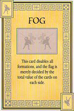 Fog: The fog card disables all formations, and the Flag is merely decided on the basis of the total value of cards on each side.