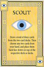 Scout: The player draws a total of three cards from one or both decks. Then he chooses any two cards from his hand and places them face down on top of their respective deck or decks.
