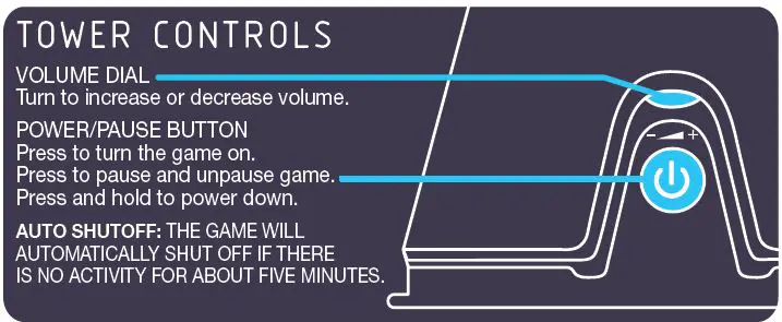 When assembled and set up, your game will look as shown below. Now just press the power button on the tower, and you're ready to play! See Tower Controls, below.