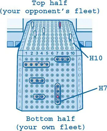 - Your opponent places a red peg at H7 on the top half of his grid.